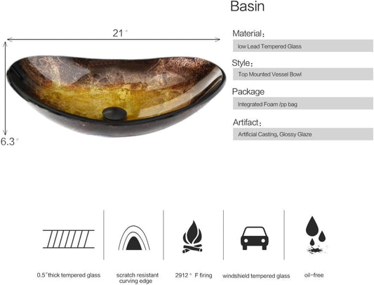 Bathroom Vessel Sink, Boat Shape Bathroom Artistic Glass Vessel Bowl Basin with Free Oil Rubbed Bronze Faucet and Pop-Up Drain, Gold Ingot