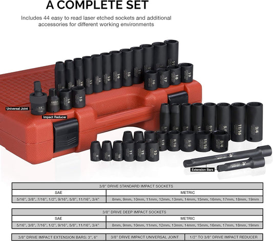 02440A 3/8-Inch-Drive Impact Socket Set, SAE Sizes 5/16" to 3/4" and Metric Sizes 8 Mm to 19 Mm, Includes Extension Bars and U-Joint, 44 Pieces